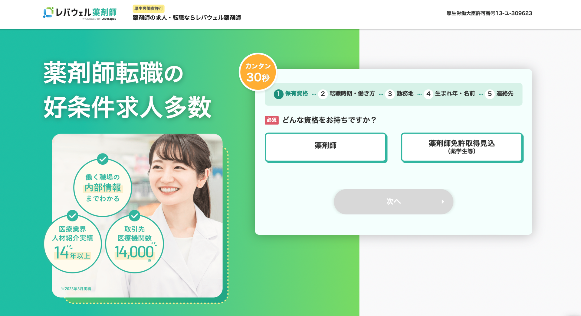 レバウェル薬剤師は、全国の調剤薬局求人を多数取り扱っている薬剤師専門の転職支援サービスです。